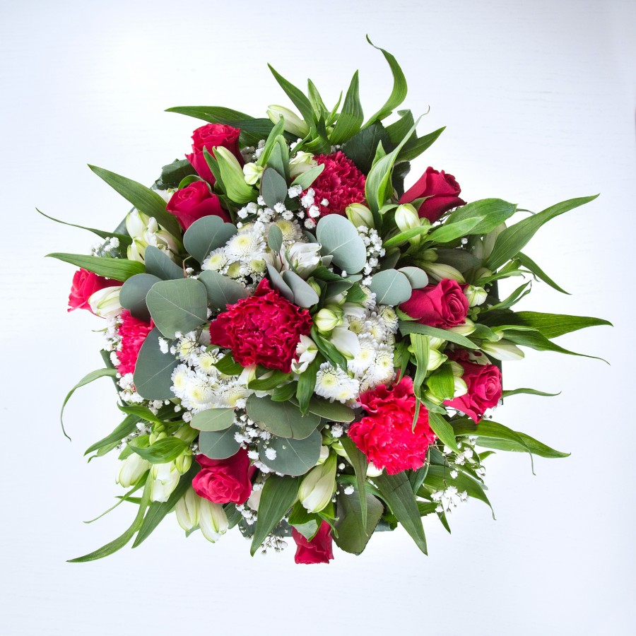 Brighten someone's day with our Radiant Red and White Flower Bouquet. This stunning arrangement features white chrysanthemums and gypsophila, complemented by vibrant red roses and charming carnations. Accented with white alstroemeria and rich aspidistra leaves, each flower is hand-selected to ensure exceptional freshness and visual appeal.